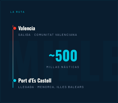 Pilotos de toda España cruzan el Mediterráneo a bordo de sus motos de agua, llegando al Port d’Es Castell en la noche del viernes. La travesía es de ida y vuelta — aproximadamente 500 millas náuticas en total entre Valencia y Menorca. La combinación de la travesía oceánica y la exhibición en puerto crea un fin de semana único en el calendario náutico nacional. Las 500 Milles son una competición independiente de la Exhibición Motonáutica — la inscripción como piloto de la exhibición no incluye participación en las 500 Milles, y viceversa.
